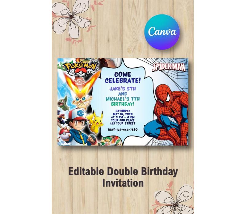Twin Pokémon and  Spiderman Invitation | Canva Template