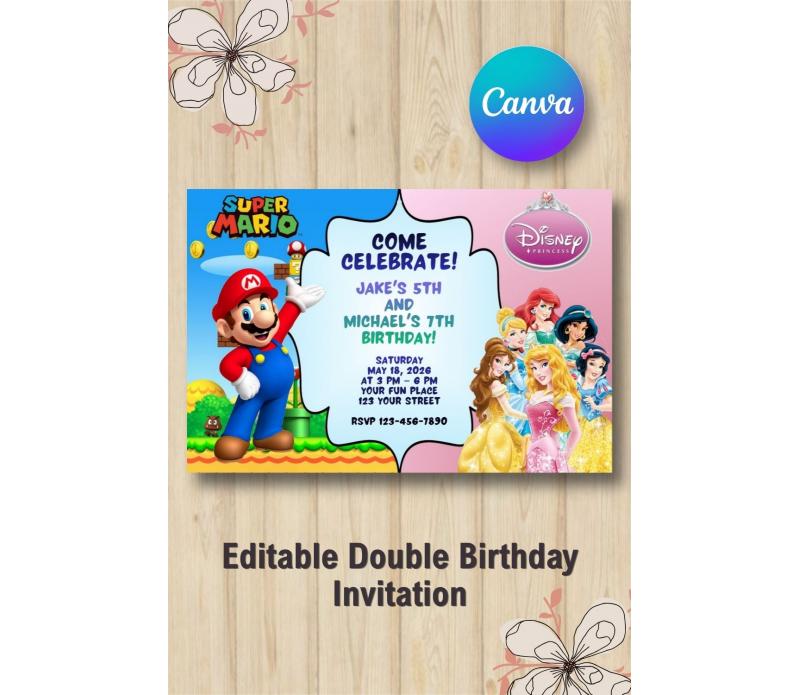 Twin Super Mario and Disney Princess Invitation | Canva Template